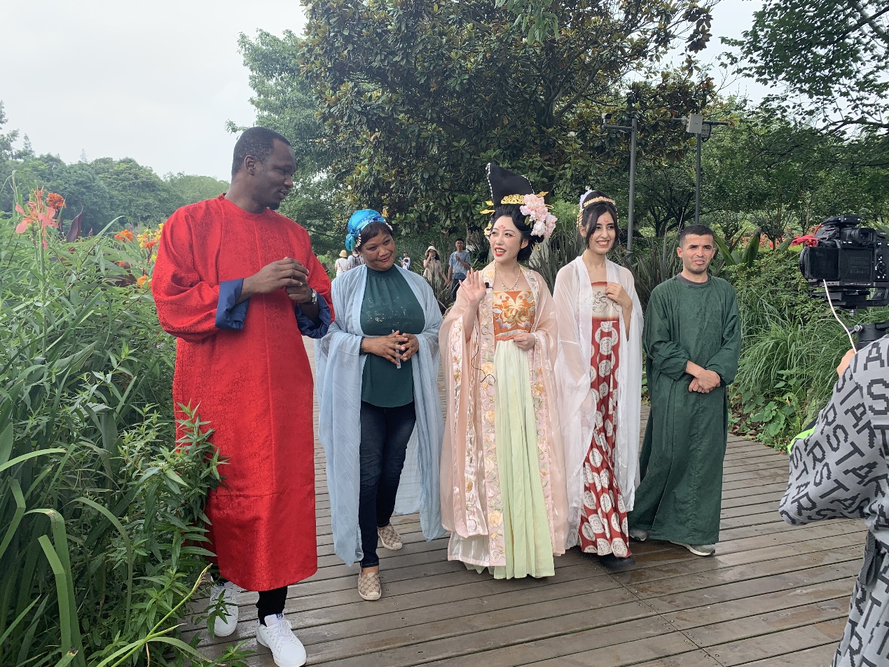 Later, at the invitation of Chengdu PLUS--the new media channel of Chengdu TV, thesefour international students and the Han Chinese Clothing expert Ting Yue Zhang Gui (听月掌柜)watchedthe cute giant pandas and learnedabout the patterns and history of Han Chinese clothing. Then, theycame tothe International Panda Art Center, where they enjoyedthepanda-themedexhibition of "Brilliant Pandas" created by a number of international artists, andappreciatedthe creations of pandas in conjunction with contemporary arts.