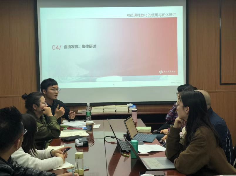 本次教研活动由初级汉语教研室主任胡翼主持并做了主旨发言,共有近20位担任初级汉语课程的教师参加。胡翼老师首先从国家、学校、学院三个层面阐述了本次研讨会的背景,接着回顾了学院近些年来各类课型使用的初级汉语教材,初级综合汉语主要采用北京语言大学出版社出版的《汉语教程》及配套的教材,包括了《汉语听力教程》和《汉语阅读教程》,口语课也使用《汉语教程》,以便配合综合课进行口语操练。写作入门课的老师选用《体验汉语写作教程》作为参考自编讲义,HSK初级讲座课选用了国家汉办出版的《标准教程HSK4(上)》,而初级视听课则是教师自编自选教学资料。然后,会议发言的教师们都围绕会议主题,对自己担任课程所使用的教材进行了介绍,发表了自己对教材使用的看法和意见,并提出了在教学过程中对教材内容的困惑。