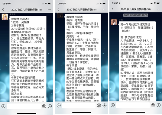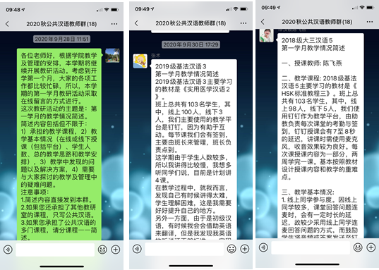 930日,海外教育学院公共汉语教研室举行了2020年秋季学期第一学月线上教研活动。由于本学期公共汉语的课程大部分在线上进行教学,此次教研活动也采用了灵活便捷的微信群互动的方式。教研活动的主题为:第一学月的学情交流与问题探讨。