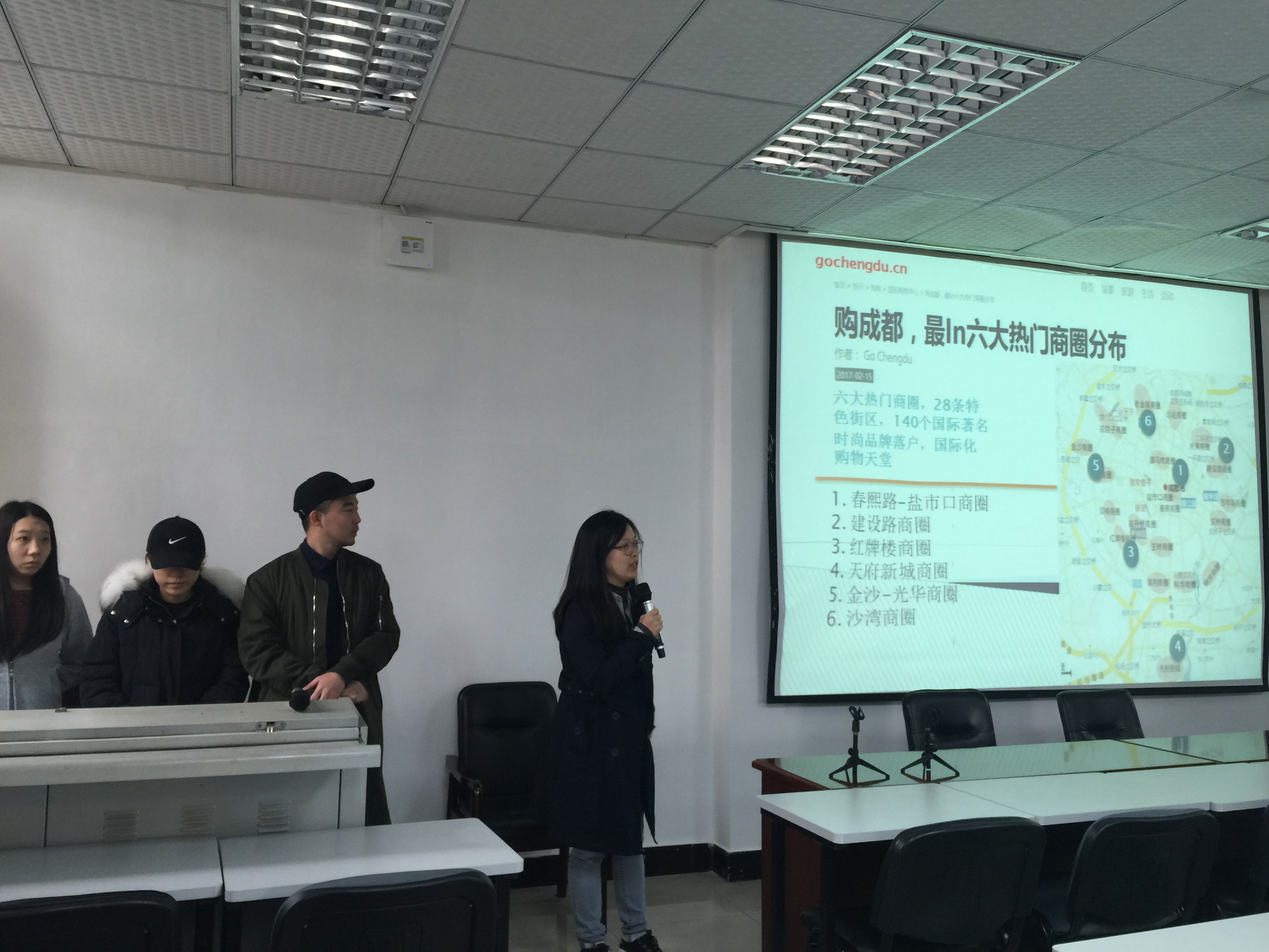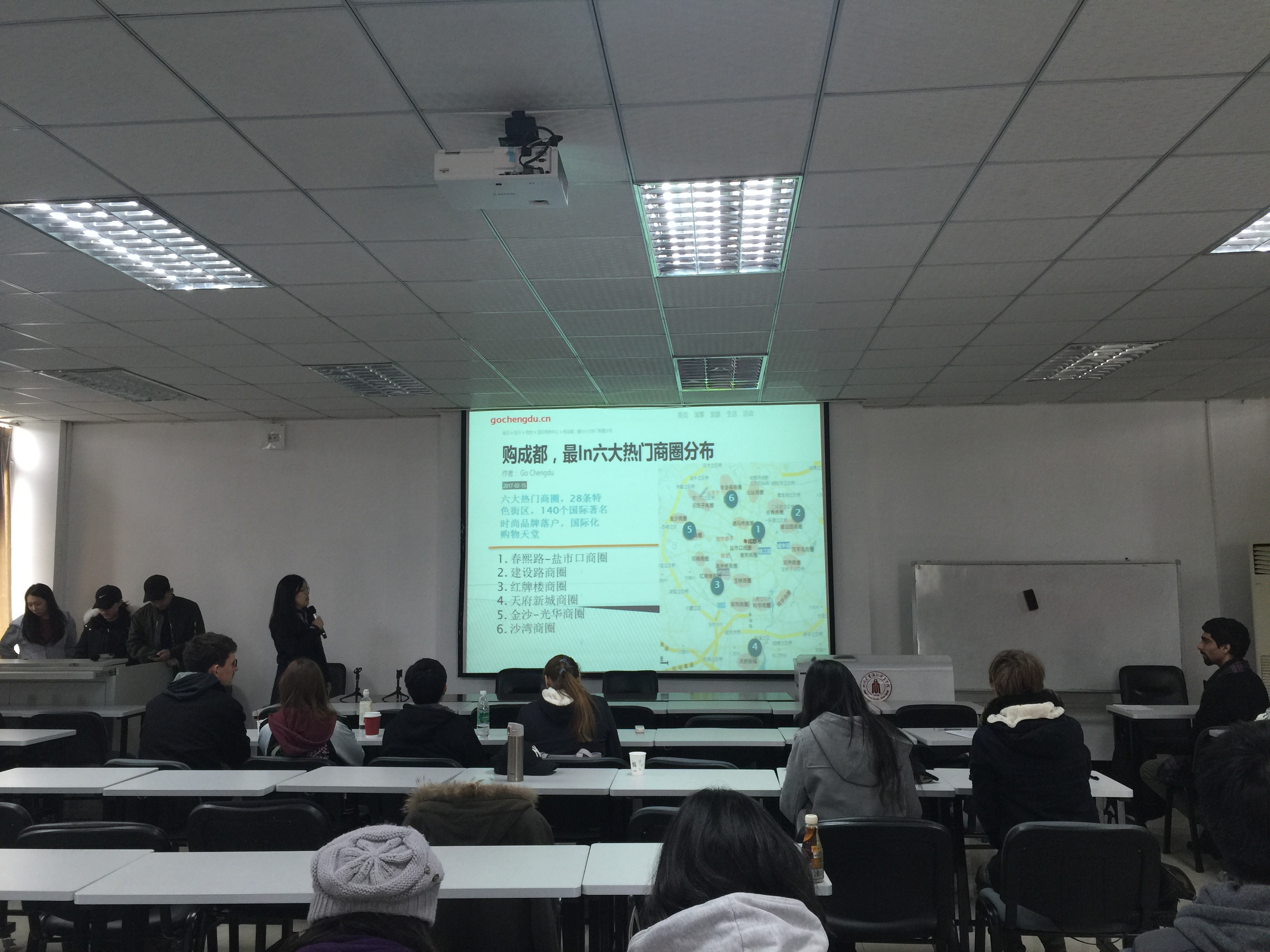 高级四班的任务是成都的商圈,报告的同学是:郭昕慈,金志睿,车知勋,吴秀庭成都本地人你知道成都的六大商圈吗?让高四的同学来告诉你吧,太古里传统又现代,低调又奢华,同学们详细地介绍了太古里的来历,特点,重点介绍了一家热门商店——By Miga,全国只有两家哦,一家在上海,另一家就在太古里啦。接下来就是采访了,看看大家对太古里的看法,结论当然是青菜萝卜各有所爱。最后还分享了自己的生意经,要做什么才能在太古里赚钱呢?
