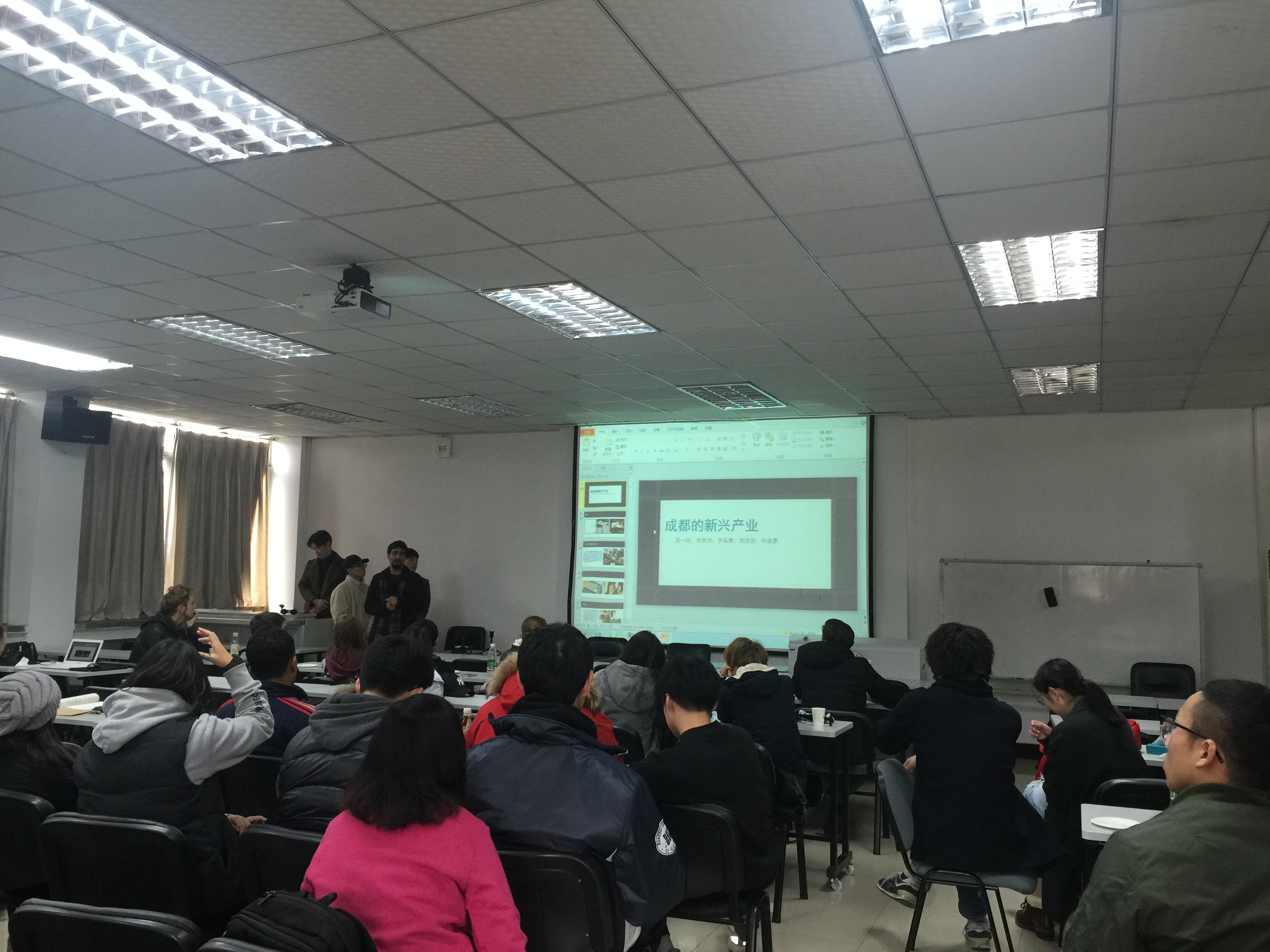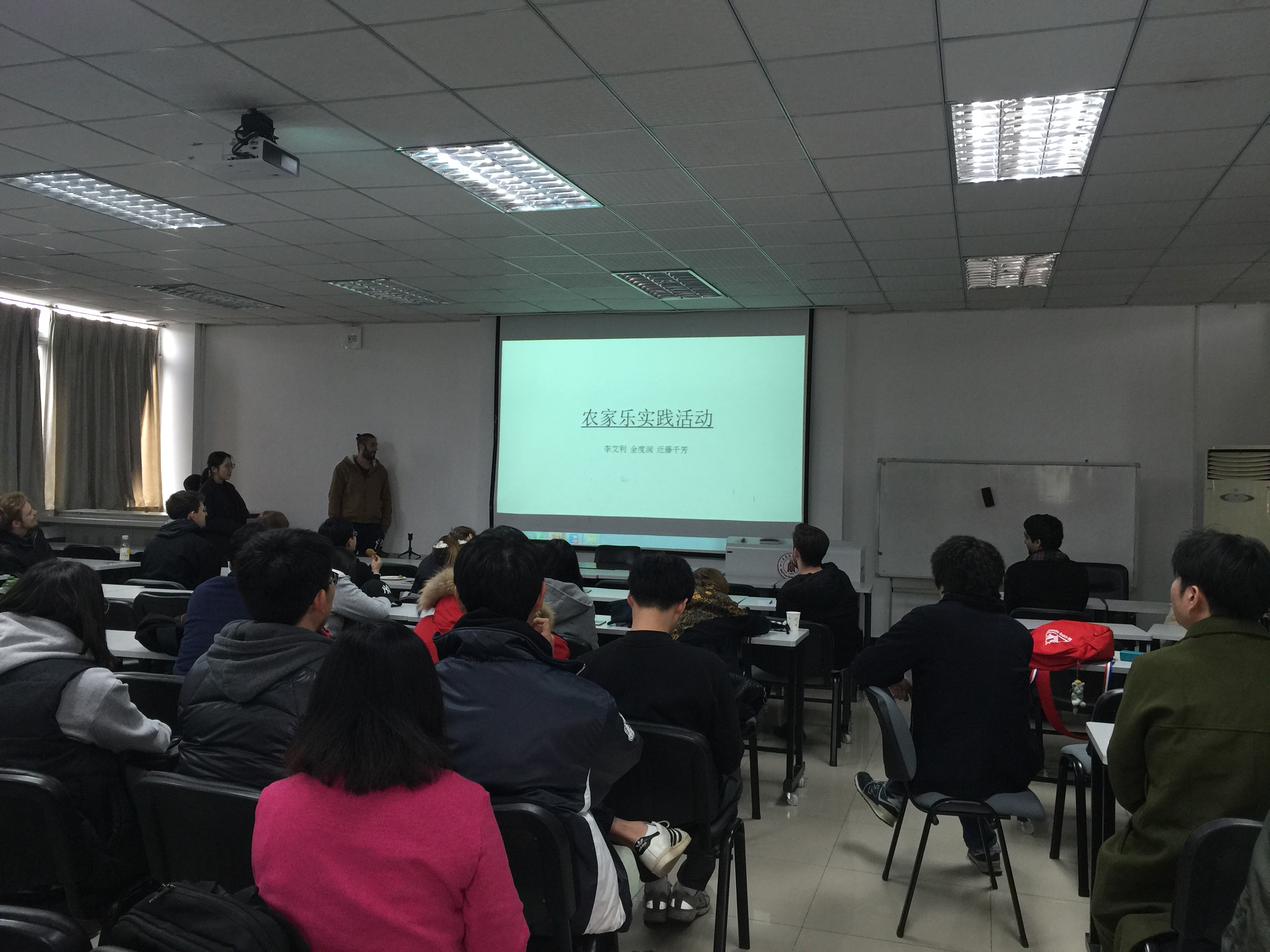 高级一班的任务是探访成都的农家乐,代表发表的同学是李艾利,金度润和近藤千芳,成都农家乐是成都人悠闲生活的代表,同学们从农家乐是什么,农家乐的历史,中外农家乐的比较等方面全方位的介绍了农家乐的前世今生,最后跟着同学们制作的视频:“农家乐一日游——本原”,享受了一把成都人的闲暇时光。