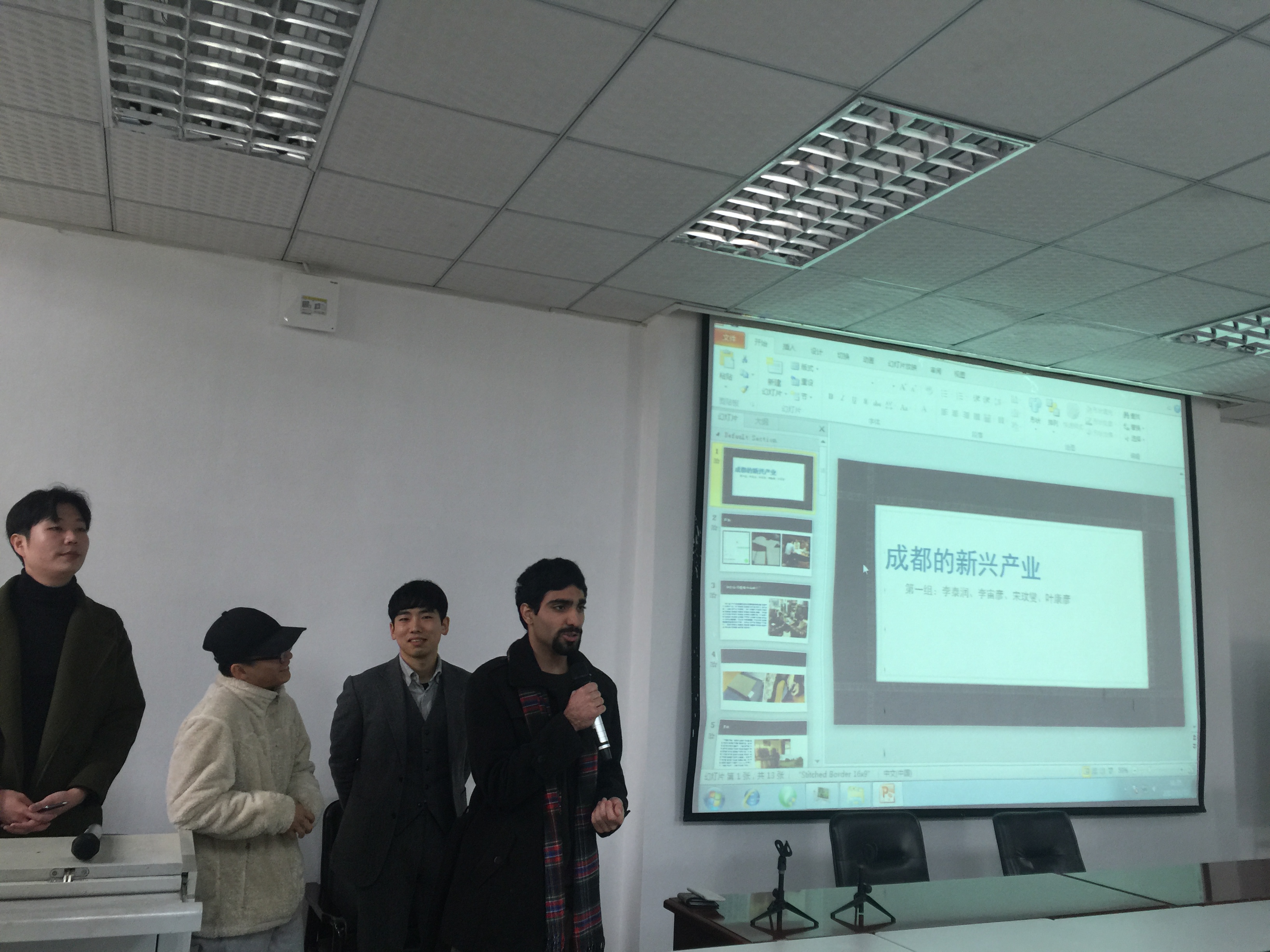 高级二班的任务是成都的新兴产业,代表发表的同学是李泰润,李宙彦,宋玟燮,叶康彦,同学们来到了一家成衣公司,这是一家尝试用新兴材质的做衣服的成衣公司,希望使用的面料环保,耐用,赚钱不是最重要的,听上去怎么那么像广告呢?不过四位帅哥这么诚恳认真地给大家介绍一家这么优秀的成衣公司,你会不会心动呢?最后还代表公司招人哦,你要去吗?