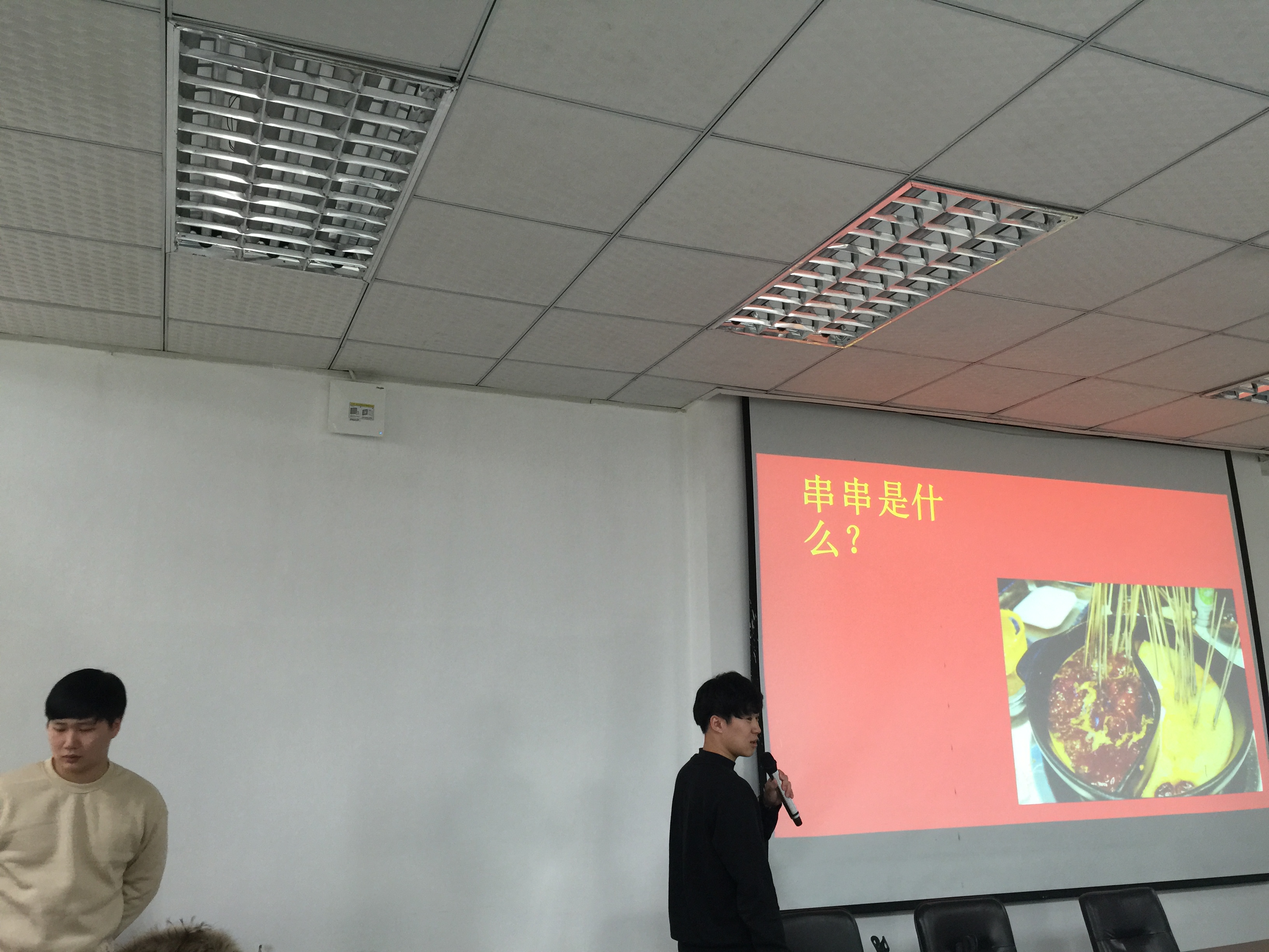 中级二班的任务是成都的小吃,代表发表的同学是李益玄和罗相叶,他们选择的串串香可谓是成都的美食符号,两位同学不仅介绍了串串香的历史,还做了实用的市场调查,什么菜好吃,什么时候人多,强烈推荐了两家火到爆的串串,看得大家口水长流。