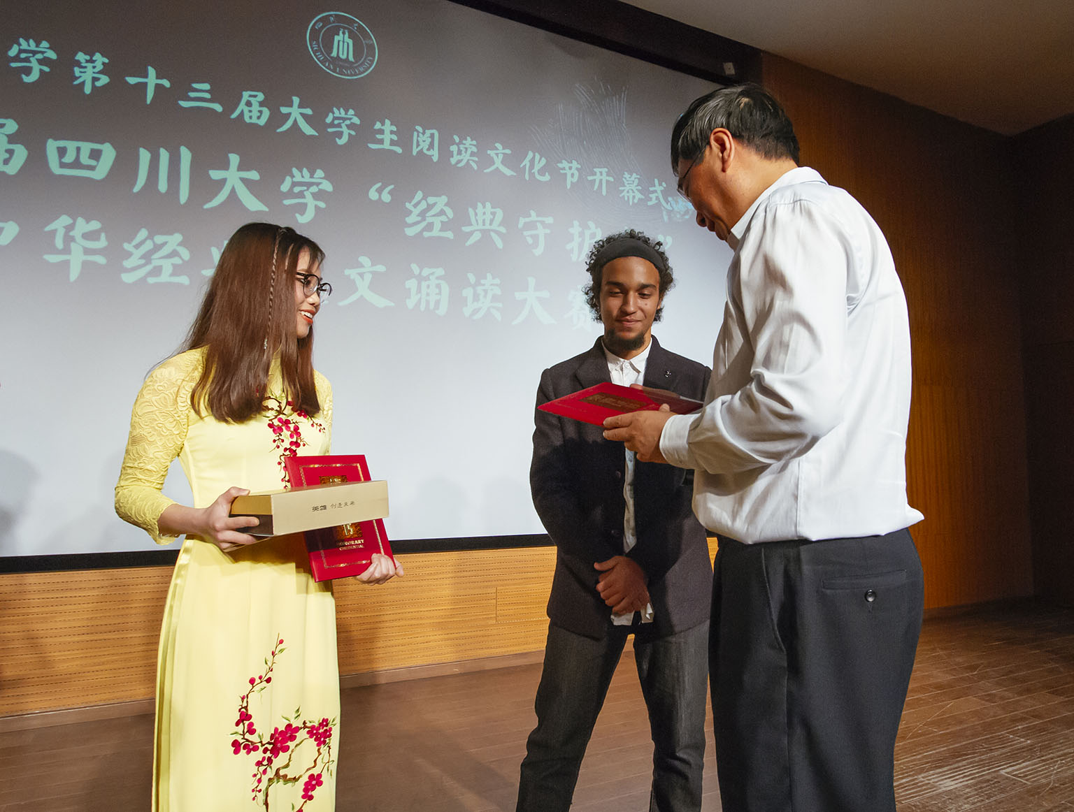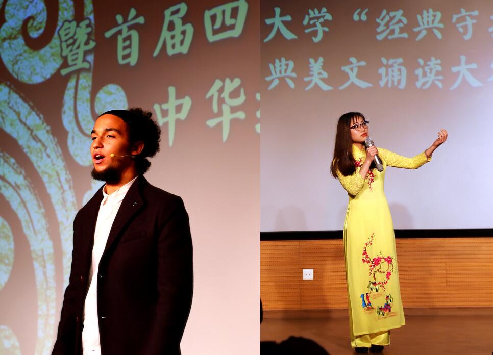 经过初选,由郑颖琦老师指导的埃及学生欧意和越南学生阮元与中国诗词大会获胜选手彭超、韩墨言一起进入大赛表演环节。比赛中,欧意以《青春中国》展示了一个朝气蓬勃、充满生机与希望的少年中国,字里行间热血澎湃着对中国的热爱、对青年的赞颂。阮元则以韵律悠扬的《水调歌头》向中国古代经典致敬,表现出了热爱生活余积极向上的乐观精神。李向成为两位留学生颁发了大赛特别奖。