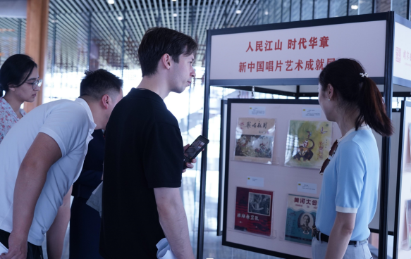 在天府新区数字文创城规划展厅,行政接待及讲解员邹杉首先向大家介绍了在序厅形象墙面上展示的习近平总书记提出的关于文化产业发展的指示,天府数字文创城规划展示厅以此为战略指引进行建设。其次,她向大家介绍了展示厅以“雁之羽”为设计理念,并通过多媒体互动演示平台和未来视窗向来访的同学们播放数字宣传片,展示天府新区的公园城市名片。留学生对展厅内所展示的内容展露出兴趣并进行讨论。