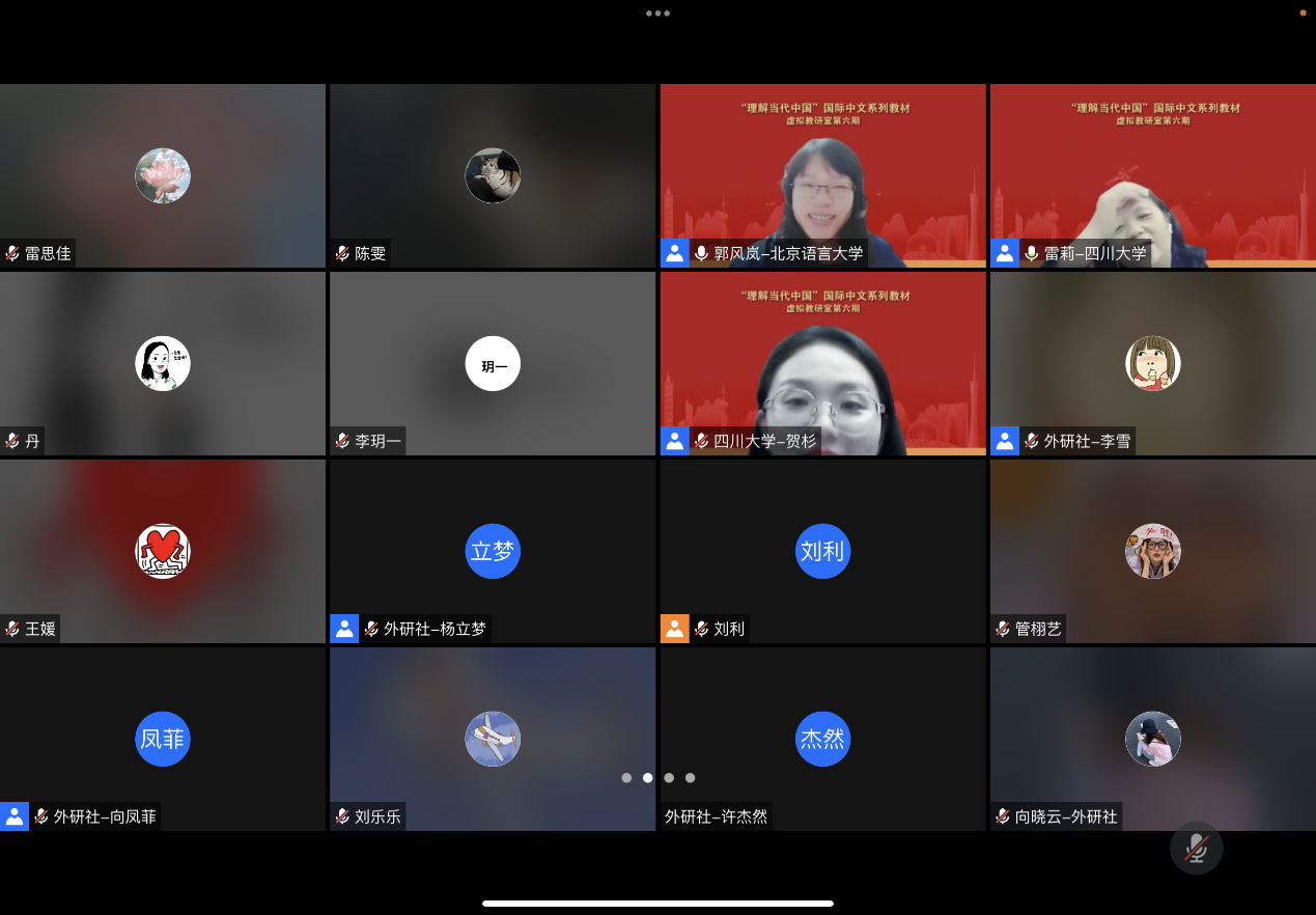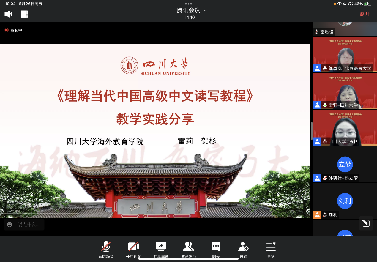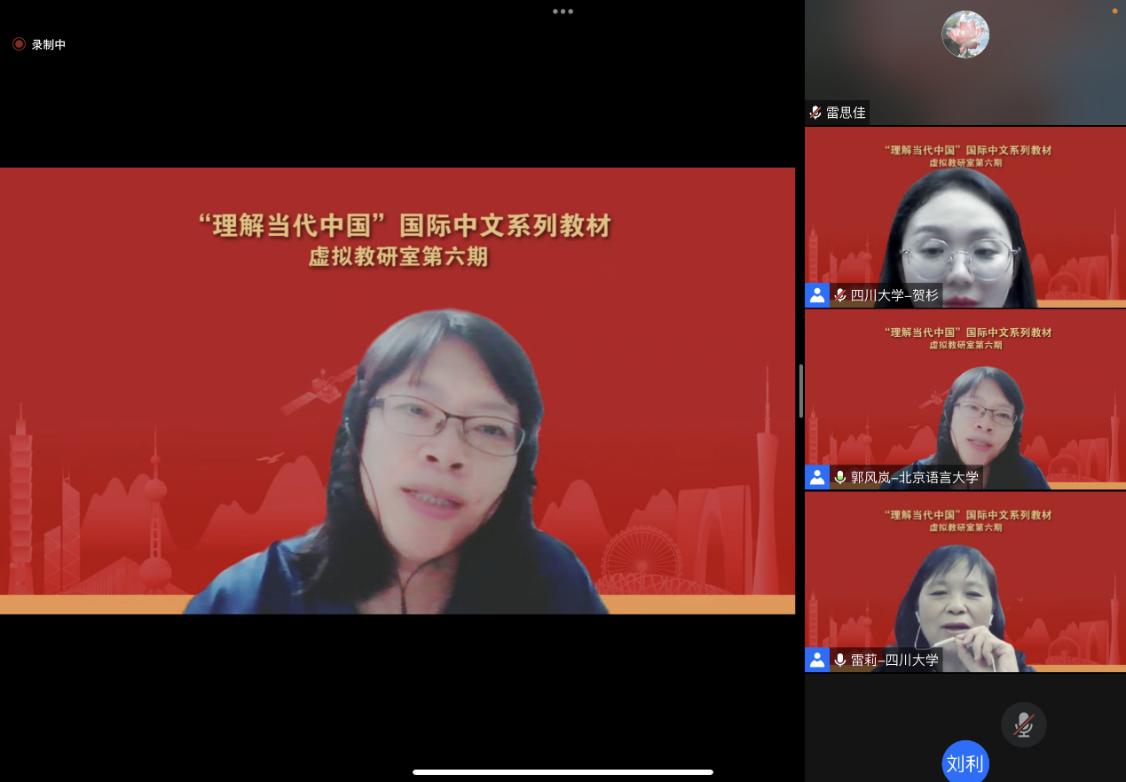 5月26日晚,由我院雷莉教授团队主讲的全国《理解当代中国》国际中文系列虚拟教研室第六期教研活动在云端成功举办。来自虚拟教研室成员高校和国内其他高校的教师、外语教学与研究出版社的领导和编辑以及我校国际汉语教育专业的师生总共70余人参加了本次教研活动。