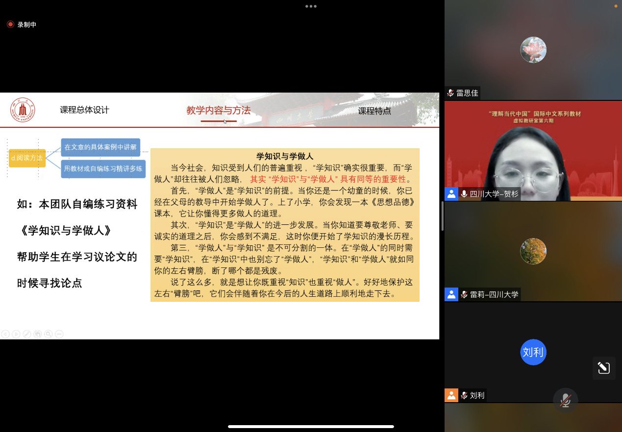 随后,雷莉团队进行了教学经验分享。雷莉结合具体授课单元及真实教学案例讲解了教学设计思路,并分享了《理解当代中国:高级中文读写教程》在yl23455永利集团海外教育学院的使用实践和课程设置、授课学时、课程评价体系等情况。雷莉教授以思维导图方式重点讲解了海外教育学院授课团队在教学资源库搭建中的思路和措施,她表示,本系列教材在理论高度、知识深度等方面均精妙入微,教学资源库的搭建旨在帮助学生更好地理解课文内容及思想内涵,有重点、有逻辑地对词汇、语句、单元内容进行学习,进而达成本课程的语言融合式教学理念及语言进阶目标。