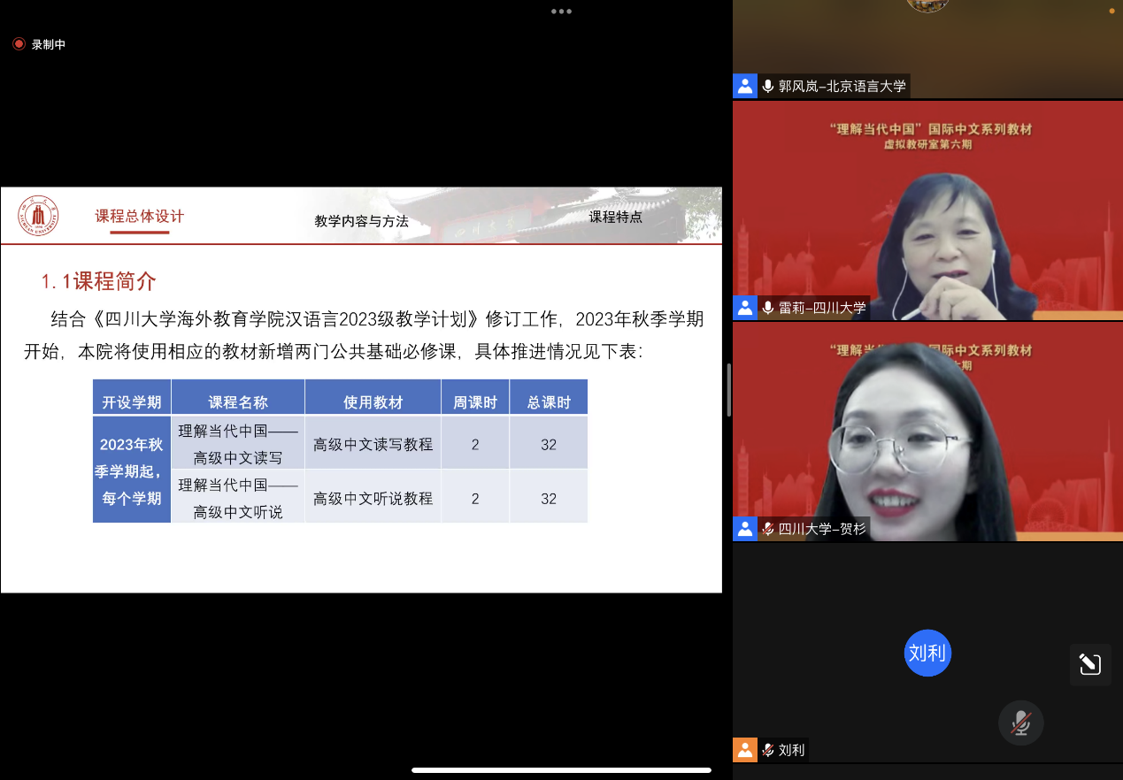 本期教研活动由《理解当代中国:高级中文读写教程》主编、北京语言大学郭风岚教授主持。活动之初,郭风岚教授首先介绍了《理解当代中国:高级中文读写教程》的编写团队、教材特点、虚拟教研室交流分享等相关情况,并对本次活动的分享者雷莉团队进行了简要介绍。