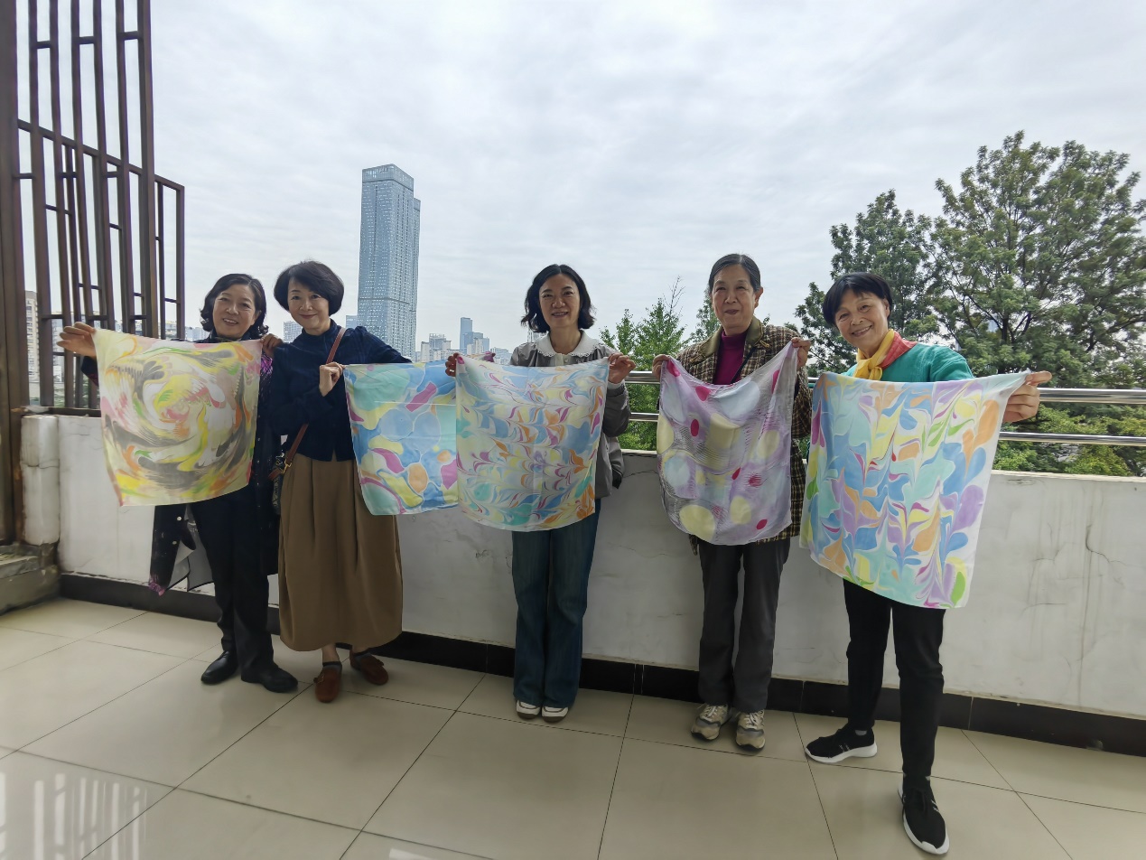 老同志们创作出的艺术品各具特色,既有大面积撞色的童趣作品,也有抽象的艺术表达。正是灵感的随意碰撞,让每一条丝巾都被赋予了退休教职工们多姿多彩的人生意义,充满了浓厚的人文特色和艺术气息。活动结束后,老同志们纷纷表示,度过了一个难忘美好的重阳佳节。