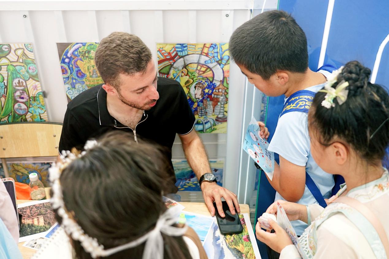 在接下来活动中,来自土耳其的白龙、乌兹别克斯坦的奇子矜和格鲁吉亚王丽洛在“小小外交官”区域摆出展台,展示了土耳其、乌兹别克斯坦和格鲁吉亚的特色文化和物品,吸引小学生们争相前来打卡和交谈。
