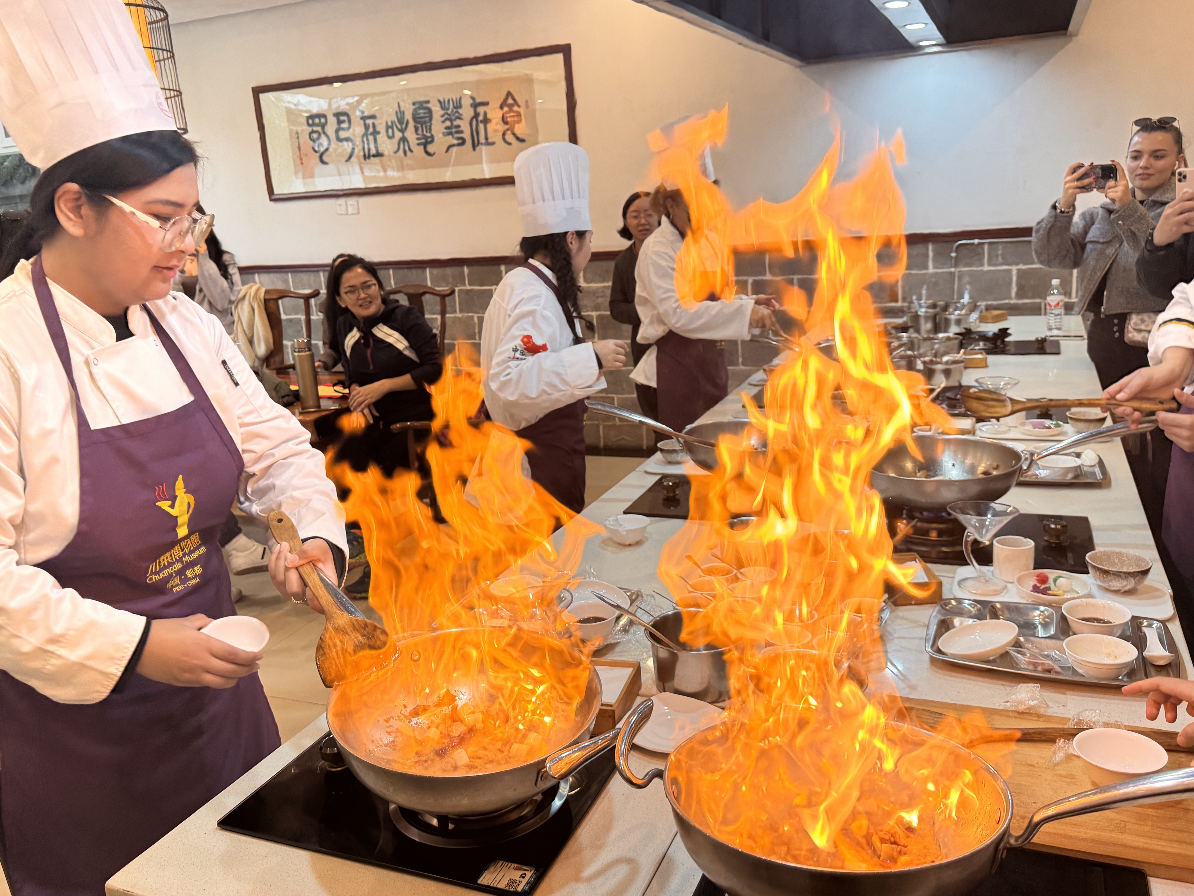 同学们踏入典藏馆,从这里开启了一场川菜文化溯源之旅。馆内陈列着从战国时期直至现代的3000多件川菜饮食器皿,其中源自汉朝的泡菜坛、清朝皇室的餐桌、四川的老式厨房与餐桌都引人注目。同学们借此深入了解了川菜的各流派特色、多样味型以及与名厨相关的名菜典故,川菜文化的悠久历史与深厚底蕴尽收眼底。