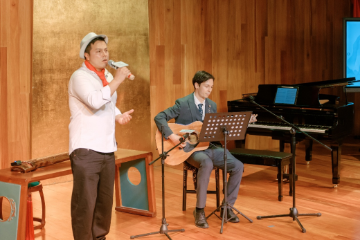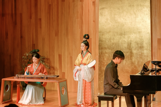 本次音乐会以“弦动四海·琴系知音”为主题,分为五个篇章,展现古琴艺术的多元魅力。中国民族管弦乐学会古琴专业委员会理事邓丽珠老师演奏的《流水》,以空灵音韵再现伯牙子期的知音之谊;“自然之诗”篇章中,青年古琴演奏者杨茗茜与钢琴演奏者陶霆屹合作演绎的《梅花三弄》,实现了古琴与钢琴的跨时空对话;《野有蔓草》则由古琴、人声与钢琴共同演绎,带领观众邂逅先秦草木间的纯真与浪漫。“情志之境”篇章里,《酒狂》以琴作剑、以鼓为马,展现了魏晋狂士的洒脱不羁;来自哥伦比亚的蓝冬少双语演唱《成都》,汉语与西班牙语碰撞出别样火花;作为晚会主持人的德国学生史雋森吉他弹唱《当你老了》,唱出了感人至深的深情。“即兴共创:和鸣之声”环节,全场共同参与,青年演奏者奏响旋律,观众以“呜”音即兴相和,创造了独一无二的“纪念音频”。最后,大家携手齐唱《友谊地久天长》,将现场气氛推向高潮。“风骨之界”篇章,古琴曲《离骚》让观众感受到屈原九死不悔的赤子之心,深刻理解了端午节背后的民族风骨,为音乐会画上了圆满的句号。