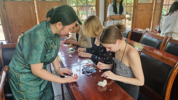 最后,留学生们根据个人兴趣,分组参与了不同的体验活动。其中,几位留学生选择体验中国传统旗袍盘扣工艺的制作。在周老师的指导下,他们从将棉花填入布艺花瓣开始,经过缝合、定型、拼接等步骤,一步一步地完成了一个精美的盘扣胸针作品,亲身感受了中国传统手工艺的细腻与魅力。