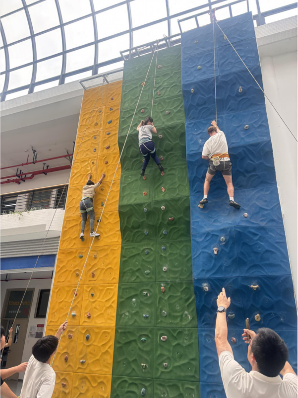 与此同时,其他留学生前往学校的室内体育馆,体验富有挑战性的运动项目——攀岩。体育馆内设有针对不同水平的攀岩墙,分为初级、中级和高级三个难度等级。在体育学院王刚、刘军两位老师的专业指导下,留学生们首先进行了一些热身活动,然后兴致勃勃地轮流上阵,学习基本的攀爬技巧,老师与助理同学积极交流,,积极尝试、挑战自我,现场气氛热烈而充满活力。