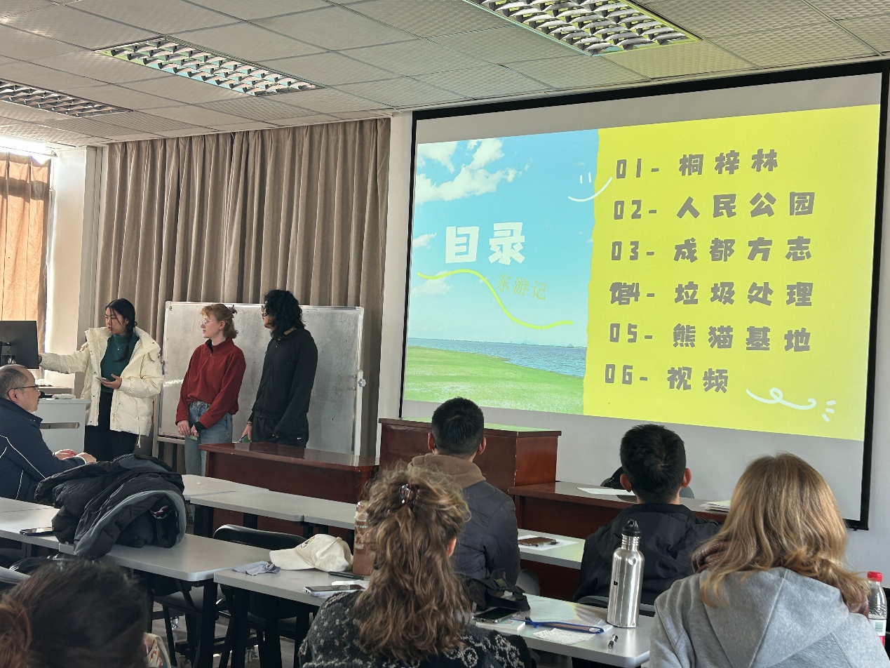 汇报开始,六个组名别有创意的小组依次登台,分别是“奇口味”、“麻辣无线”、“国际超级眼镜队”、“六六六”、“东游记”和“七个小矮人和白雪公主”,他们借助精心准备的PPT和短视频,用日渐流利的汉语生动分享前五次实践活动的见闻。从桐梓林社区的国际化氛围,到方志馆里厚重的成都历史;从人民公园的市井温情、熊猫基地的生机盎然再到垃圾处理厂“变废为宝”的环保科技——每一句表达都源于真实的脚步,每一段讲述都浸透着实践的收获。