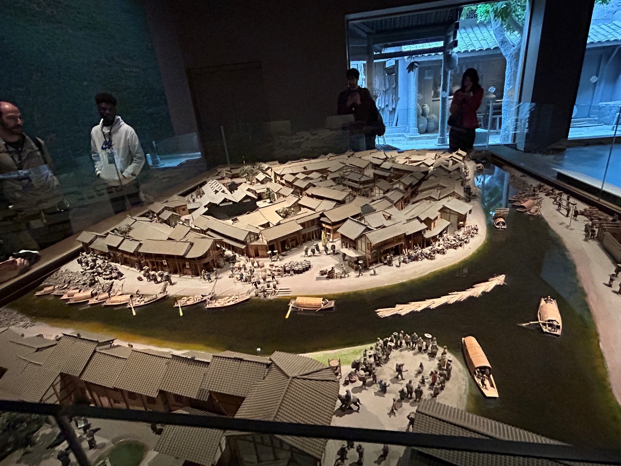 活动伊始,讲解员借助精致的沙盘娓娓道来,为同学们展开水井街六百余年的历史画卷。1998年8月,全兴酒厂一次寻常的车间改造,发掘出了锦江春、天号陈等珍贵瓷片,竟意外揭开了埋藏地下的明代酿酒遗址。这些残片是过往名酒的见证,更是后世考证全兴大曲数百年古酿历史的印记。地上与地下,不同时代的酒坊如影随形、层叠共存,有力印证了此处连续六百余年从未间断的酿酒史诗。这就是水井坊,中国白酒第一坊。经过讲解员的讲解,同学们直观感受到历史尘埃中蕴藏的惊人生命力,不禁连连点头,赞叹不已。