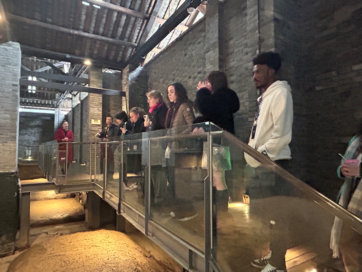 跟随讲解员的步伐,同学们步入真实的酿酒遗址区。古老的酒窖、晾堂、整流器基座、灶坑以及昔日的制造车间静静陈列,仿佛仍在呼吸。同学们认真观察,不时低头相互交流、气氛热烈。与此同时,毗邻的传统车间里,工人们正忙碌于窖池发酵、上甑蒸馏,酒香弥漫,蒸汽氤氲。之后,讲解员说明了水井坊酒传统酿造技艺是国家非物质文化遗产,九代相传,技艺精湛。在这里,同学们不仅看到了静态的文物遗址,更目睹了活态传承的酿造现场,深刻了解了中国白酒文化的“活文物”。