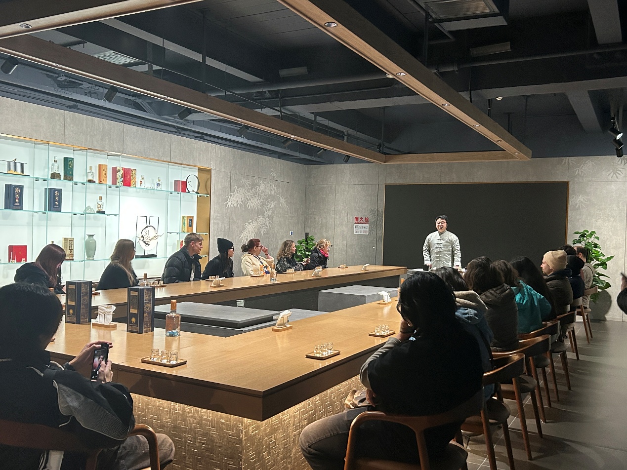 活动的又一亮点是专业品酒环节。在品酒师的指导下,同学们学习了“观色、闻香、品味”的步骤。三杯酒依次端上,其中2号杯酒体微黄,窖藏时间达21年,酒精度61度,品酒师形容其“味道绵长、口感柔和”。同学们欣赏酒香,品尝味道,纷纷提问,与品酒师展开热烈讨论。在白酒的醇香与绵长口感之中,留学生们对传统酒文化有了真切的感性认识。