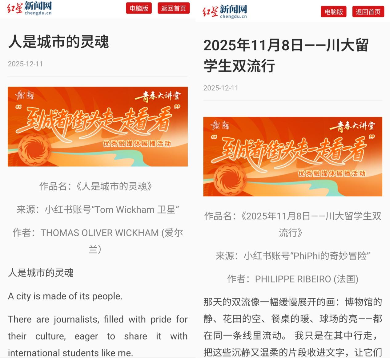 在"青春大讲堂——到成都街头走一走看一看"优秀融媒体展播活动中,获奖学生及对应作品如下:THOMAS OLIVER WICKHAM (卫星,爱尔兰),作品:《人是城市的灵魂》;PHILIPPE RIBEIRO (李北洛,法国),作品名:《2025年11月8日——川大留学生双流行》。以下为红星新闻网展播页面:https://topvote.chengdu.cn/acts/2025_qcdjt_show_wap/