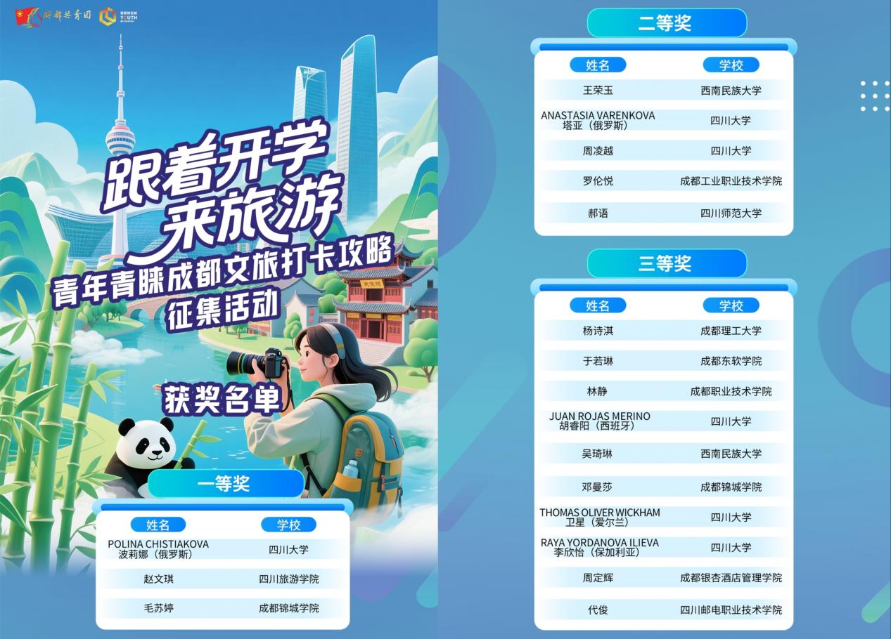 在“跟着开学来旅游・青年青睐成都文旅打卡攻略征集活动”中,获奖学生为:一等奖POLINA CHISTIAKOVA (波莉娜,俄罗斯);二等奖ANASTASIA VARENKOVA (塔亚,俄罗斯);三等奖JUAN ROJAS MERINO ROMNO (胡睿阳,西班牙)、THOMAS OLIVER WICKHAM (卫星,爱尔兰)、RAYA YORDANOVA ILIEVA (李欣怡,保加利亚)。