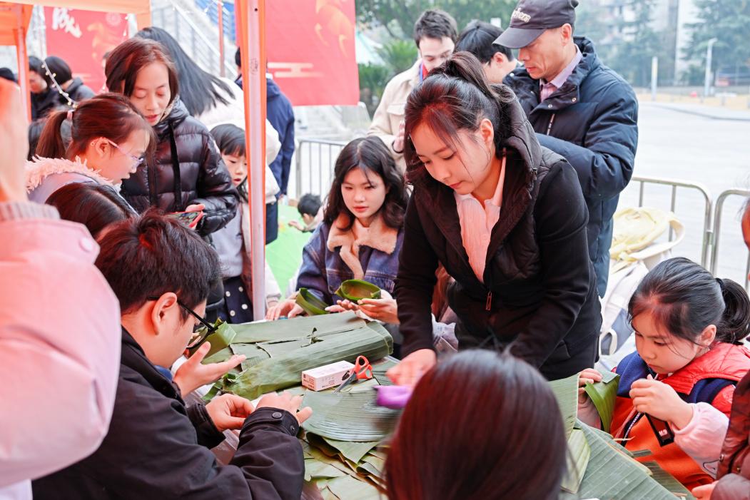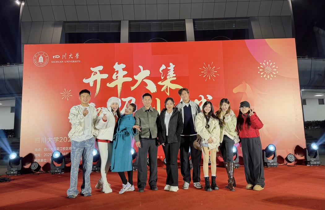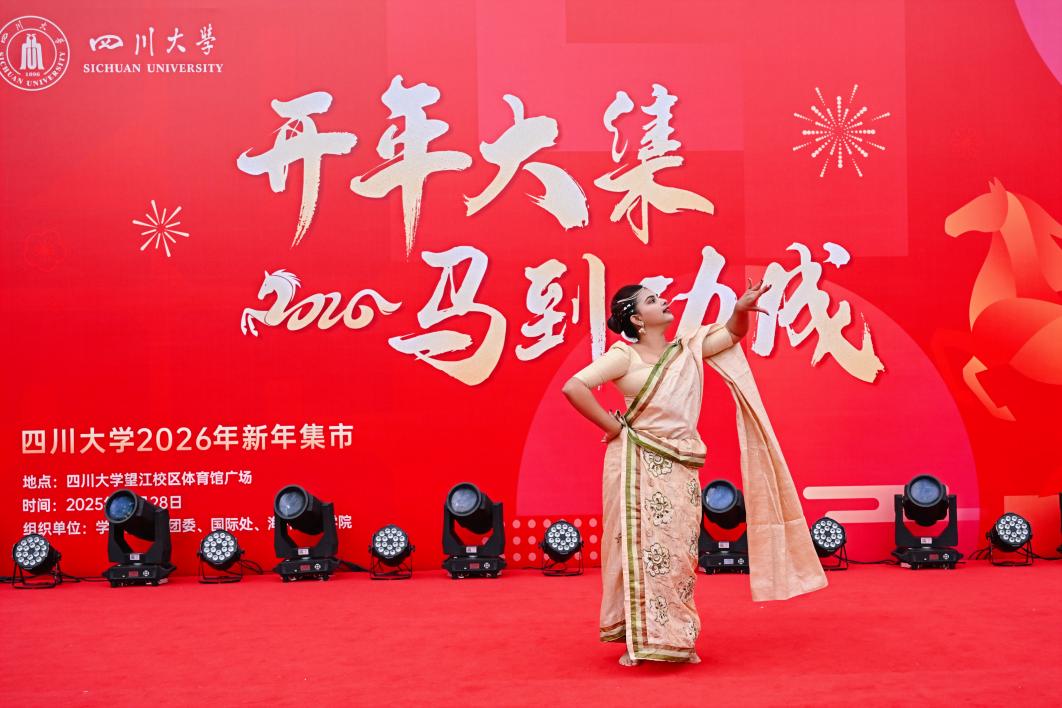 2025年12月28日下午三点到晚上八点,yl23455永利集团新年集市(望江场)在望江校区体育馆广场举行,本次活动由学工部、校团委、国际处和海外教育学院共同举办。新年集市现场张灯结彩、喜庆祥和、热闹非凡,集市以“开年大集、马到功成”为主题,现场设置了青神竹编、新繁棕编、蛋壳画、剪纸、糖画、成都面人、扇面绘画、油纸伞绘画、写对联、写福字、世界美食等体验展台。同时,现场还安排了中外歌曲演唱、传统乐器演奏、威风鼓、太极拳、茶艺、川剧变脸、舞狮等节目表演,为游览集市的师生带来了一场妙趣横生的非遗体验和精彩纷呈的舞台演出。