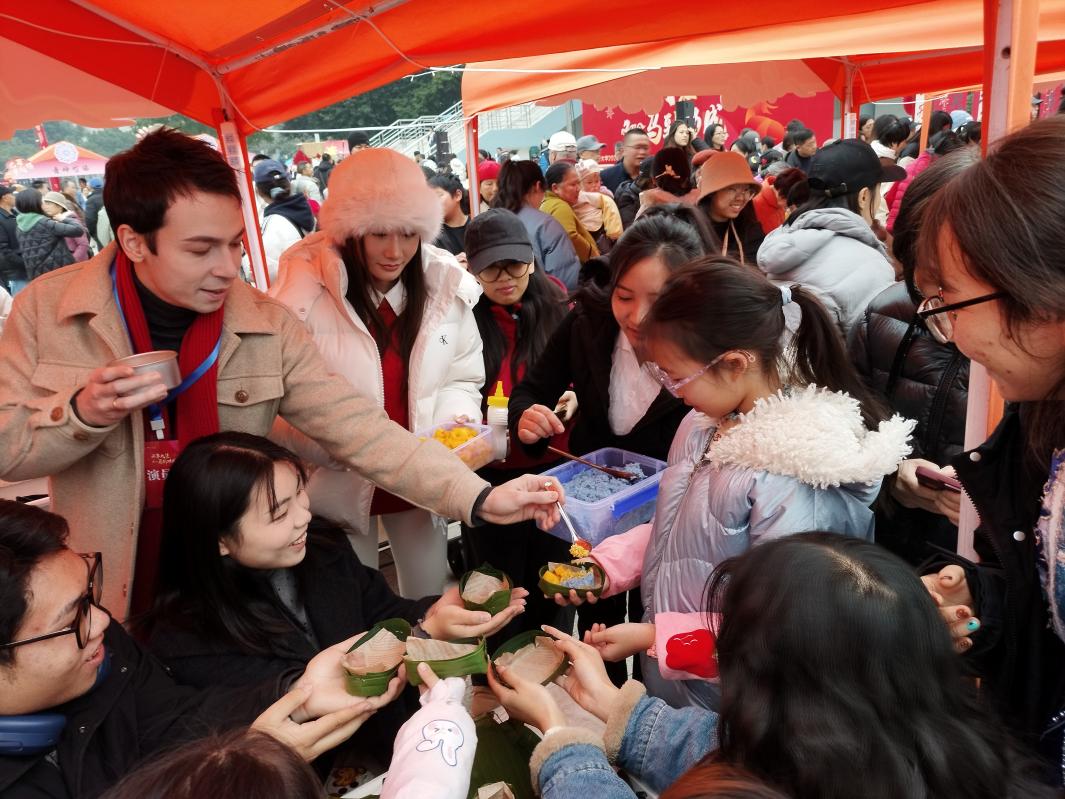 海外教育学院积极参与本次新年集市的组织策划,负责“世界时刻---多国文化展示交流”展台,并选送五个节目参与现场表演。在学生科科长刘廷林老师的组织下,来自泰国、法国、印度、越南、斯里兰卡等国留学生,为逛展师生精心准备了泰国传统甜品芒果糯米饭,观众先体验用粽叶裁剪折叠制作餐盘,再盛上芒果、椰浆、炸绿豆仁和糯米饭,一份香糯可口的甜品便制作完成,配上泰国特色蝶豆花茶(Butterfly Pea Tea),便是视觉和味蕾的双重享受,现场参与体验的师生络绎不绝,品尝美食后均赞不绝口。