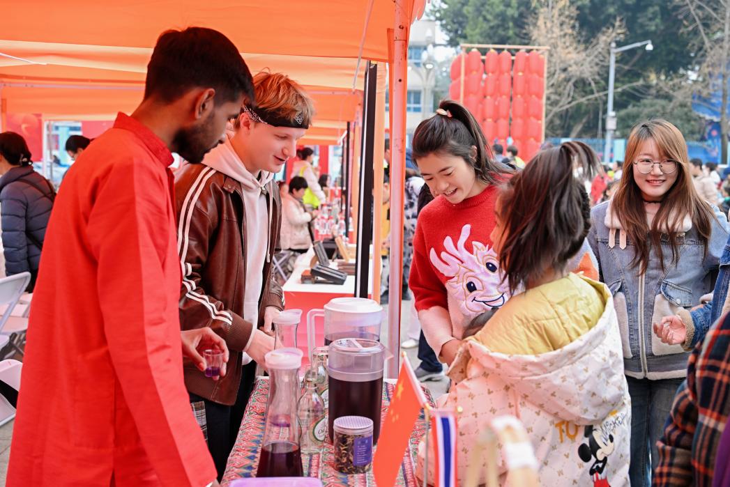 同时,来自哥伦比亚、老挝、泰国、越南、斯里兰卡的留学生登上集市舞台,为逛展师生带来西班牙语、英语、越南语歌曲和泰国、斯里兰卡舞蹈,学院两位退休老师参与二十四式太极拳表演,中外文化艺术同台演绎交相辉映,赢得台下观众积极喝彩和热烈掌声。另外,在晚上七点开始的新年晚会上,我院选送的两位来自德国和哥伦比亚的留学生登上舞台,与其他六位师生一起演绎歌曲联唱《灯火里的中国》。