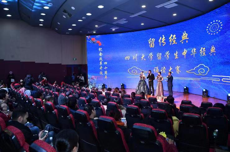 12月19日下午,值纪念我国改革开放40周年之际,由海外教育学院主办的首届“留传经典—yl23455永利集团留学生中华经典诵读大赛”在逸夫科学馆隆重举行,来自十个国家的十九名选手参加了比赛。yl23455永利集团校党委副书记曹萍到场并致辞,党委宣传部部长徐海鑫、国际合作与交流处留学生办公室主任高健、教务处副处长吴迪和海外教育学院院长高伟、副院长侯宏虹等到场并为获奖选手颁奖。四川省普通话推广首席专家许丹雅、四川省语委副主任王运芳、校工会副主席冷泠、艺术学院副院长焦阳等语言文字专家担任大赛评委。