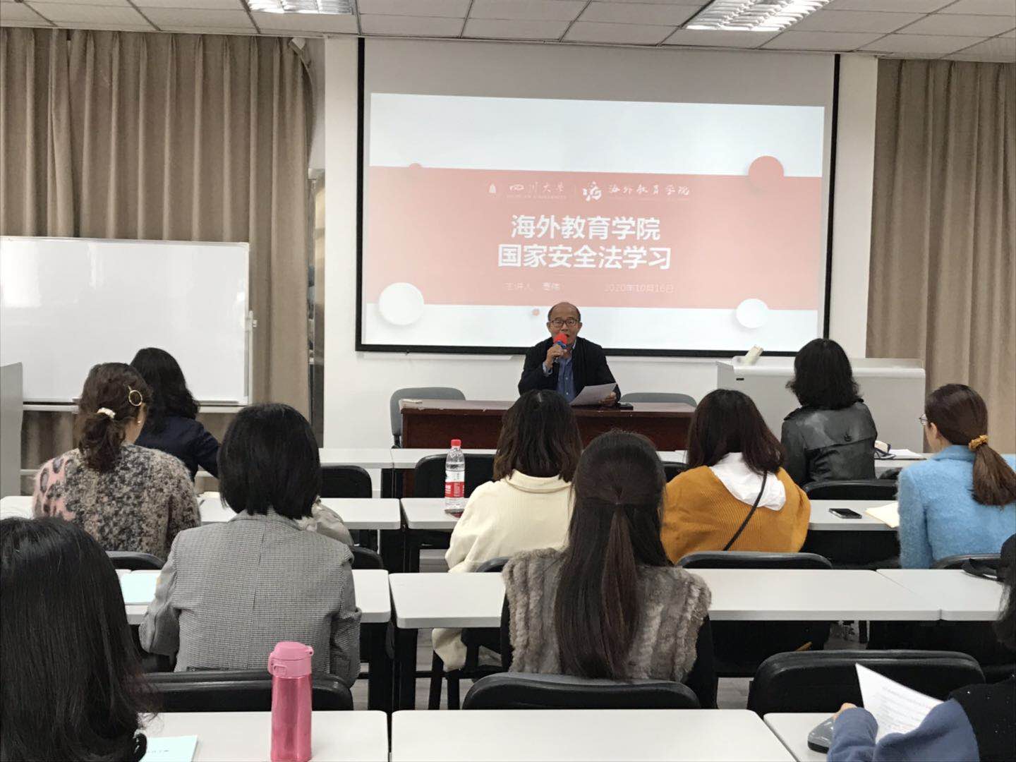 2020年10月16日上午,海外教育学院在学院多功能厅组织全院教职工开展国家安全教育学习活动及政治学习会,学院领导班子和全体教职工参加。院长高伟作了主题讲座:“站在历史正确的一边——告台湾情治部门书”,他阐述了国家安全的重要性以及当前的国内外形势,希望全体教职工加强国家安全意识和防范能力,共同捍卫祖国统一。随后,按照学校党政办要求,学院组织全体教职工收看2020年10月10日中央电视台《新闻联播》节目、2020年10月10日、11日、12日播出的《焦点访谈》栏目,大力开展国家安全教育。