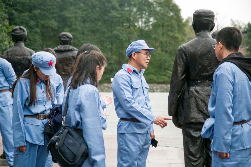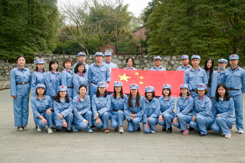 参观结束后,全体教职工在中国抗日壮士群雕广场身穿红军服,头戴红军帽,饱含深情地唱起了《绣红旗》《歌唱祖国》《一条大河》等红色歌曲,并通过接力的方式,大家你一针,我一线,共同绣起了红旗。大家情绪高昂、歌声嘹亮,抒发着无限的爱国、爱党情怀,唱响了对实现中华民族伟大复兴中国梦的坚定信心!