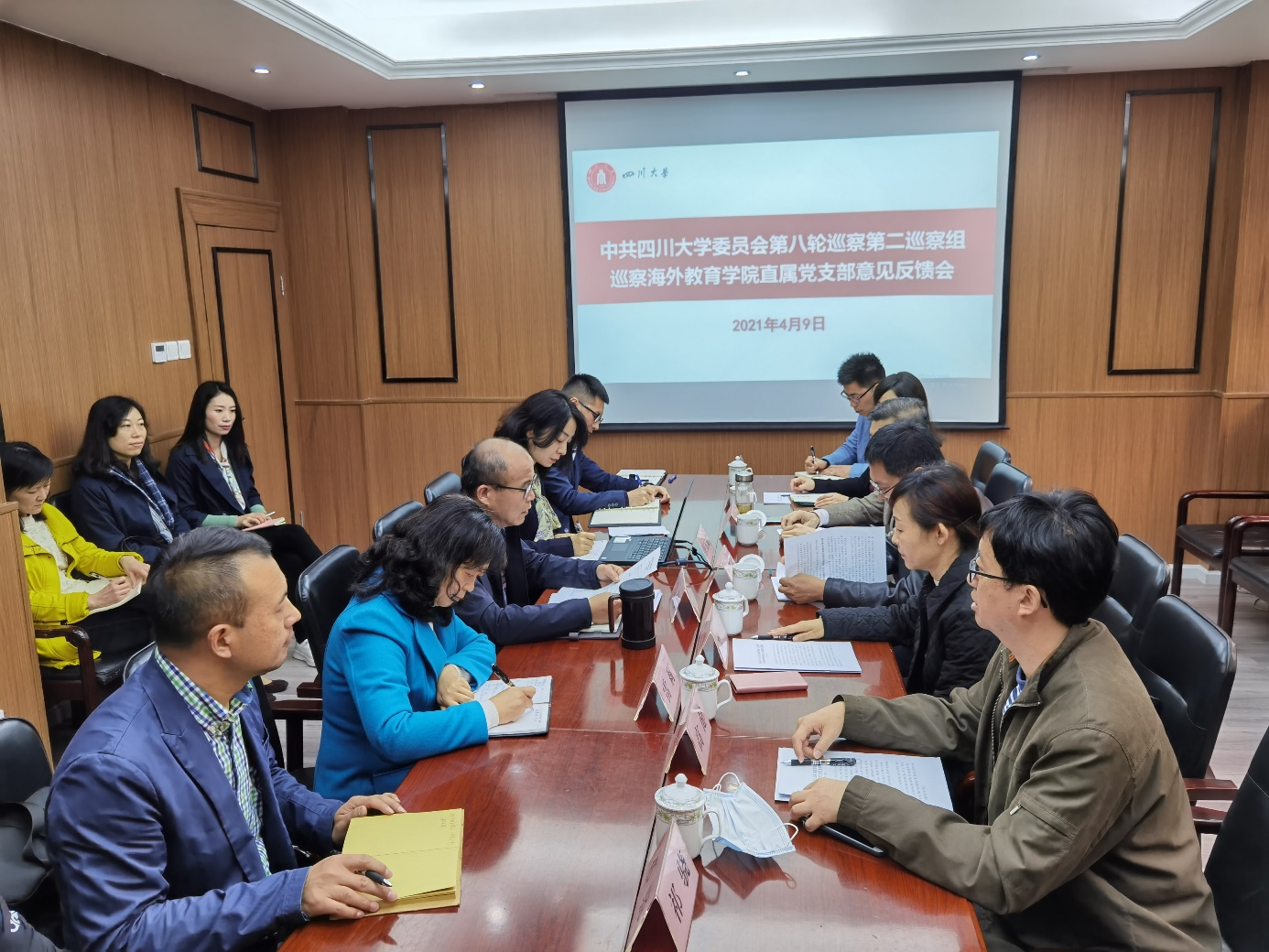 4月9日上午,学校党委第八轮巡察第二巡察组巡察海外教育学院直属党支部情况反馈会在海外教育学院二楼会议室举行。第二巡察组组长熊兰,副组长高健、鲍成志向海外教育学院党政主要负责人反馈巡察情况后,熊兰代表巡察组进行了班子反馈。校巡察工作领导小组成员、党委组织部常务副部长王智猛参加会议并提出巡察整改工作要求。海外教育学院直属党支部书记高伟主持会议并作表态发言。