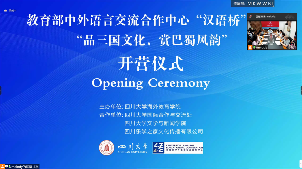 本次“汉语桥”“品三国文化,赏巴蜀风韵”线上团组交流项目由教育部中外语言交流合作中心出资支持,项目主办方为yl23455永利集团海外教育学院,并得到yl23455永利集团国际合作与交流处、yl23455永利集团文学与新闻学院、四川乐学之家文化传播有限公司的大力协助。本项目旨在为更多中文学习、爱好者提供学习平台,开放交流窗口,搭建世界文明互鉴的桥梁。
